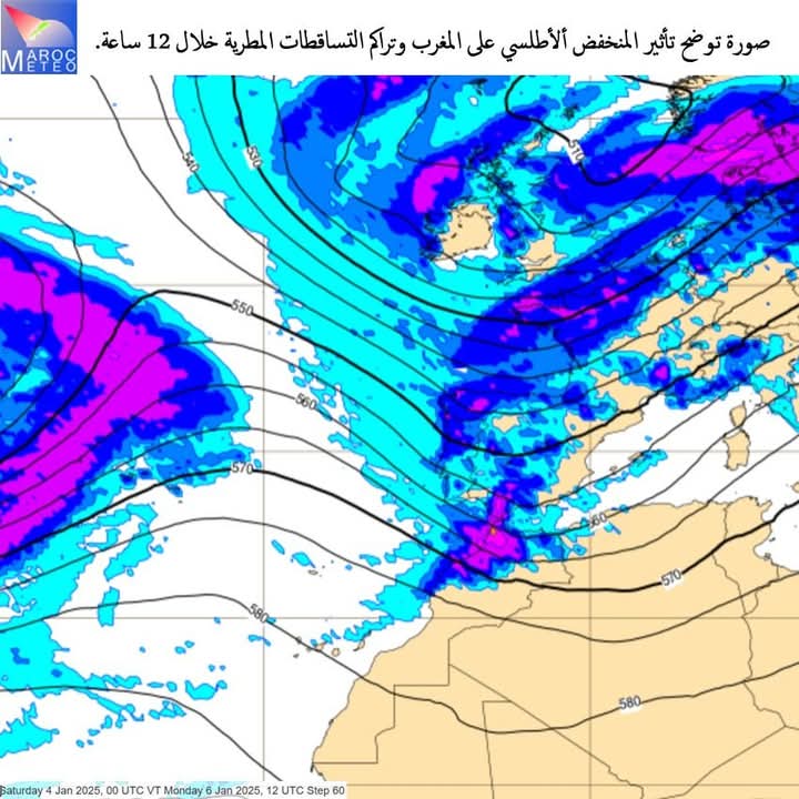 ابتداء من يوم الأحد من المتوقع بحول الله أن تشهد الحالة الجوية تغييرا ببلادنا وذلك نتيجة تأثير منخفض جوي أطلسي متمركز غرب أوروبا، والذي تمتد أطرافه الجنوبية نحو شمال المغرب، مما ينتج عنه تشكّل تيار غربي يحمل سحبًا ممطرة ابتداءً من فترة ما بعد ظهر يوم الأحد وخلال الليلة الموالية. ستهم هذه السحب الممطرة السهول الأطلسية شمال آسفي، وهضاب الفوسفاط وأولماس، ومنطقة الريف، والواجهة المتوسطية، مع إمكانية امتدادها نحو المناطق الداخلية لتشمل سايس ومرتفعات الأطلس المتوسط. وقد ترافق هذه الأمطار رياح قوية وانخفاض في درجات الحرارة. هذا ويتوقع ان تكون هناك امطار غزيرة مصحوبة بعواصف رعدية بأقصى شمال البلاد.
