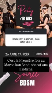 في سابقة أثارت جدلاً واسعاً على مواقع التواصل الاجتماعي، ومباشرة بعد شهر رمضان الفضيل والشعب المغربي المسلم مازال يعيش أجواء روحانية مفعمة بالإيمان انتشرت مؤخراً صور ترويجية لما يُسمى بـ”حفلة BDSM” المقررة تنظيمها بمدينة طنجة يوم 26 أبريل الجاري، وهي حفلة تم الترويج لها بعبارات مثيرة تحمل طابعاً إيحائياً واضحاً، وتظهر فيها شخصيات شبه عارية ترتدي أزياء لا تمت بأي صلة لأخلاقيات وثقافة المجتمع المغربي المحافظ.