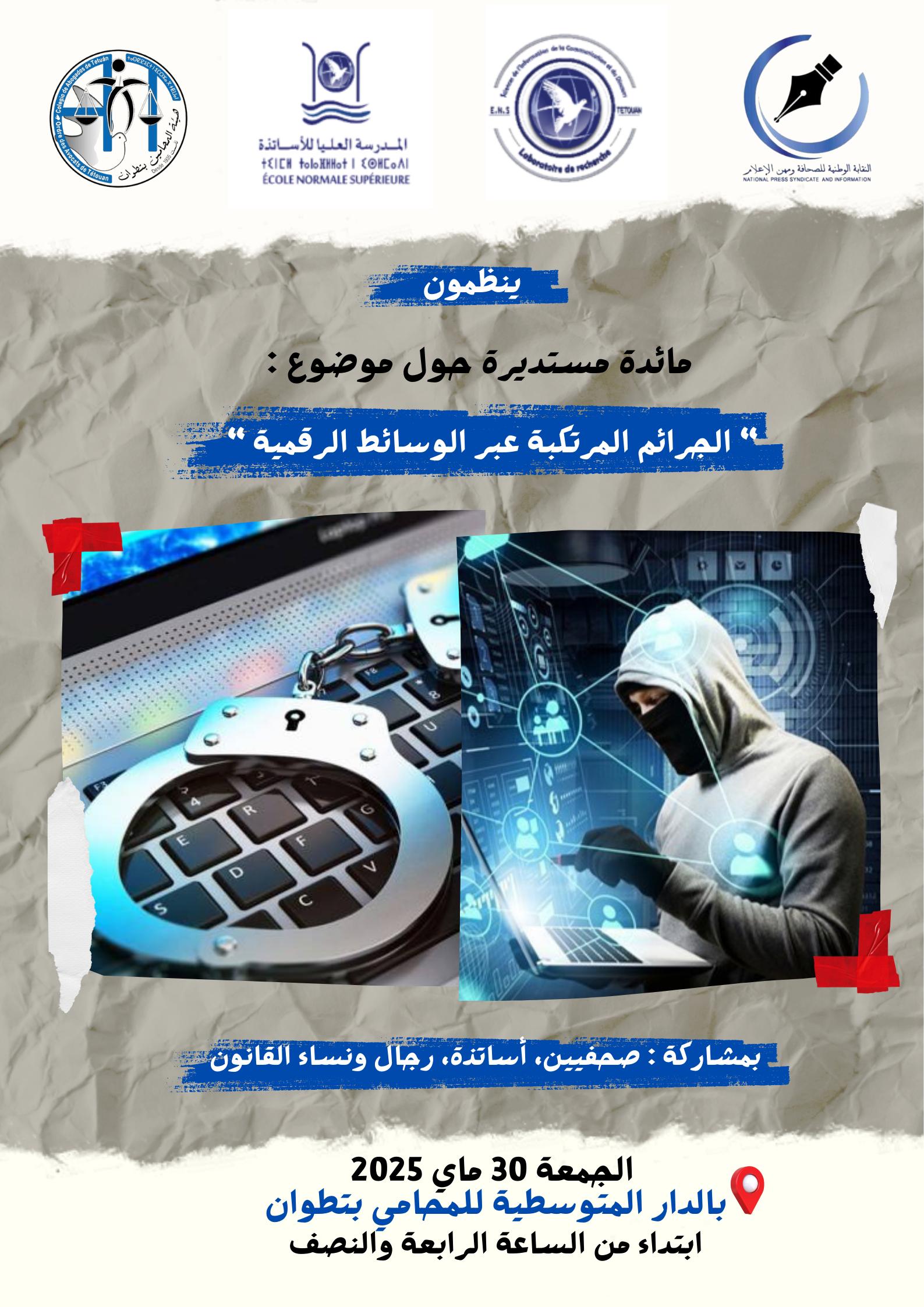 في إطار الاهتمام المتزايد بمخاطر الفضاء الرقمي، ينظم كل من مختبر البحث في الحكامة والتنمية المستدامة، والمدرسة العليا للأساتذة بتطوان، بشراكة مع الهيئة الوطنية للصحافة والنشر والإعلام، مائدة مستديرة حول موضوع: “الجرائم المرتكبة عبر الوسائط الرقمية”، وذلك يوم الجمعة 30 ماي 2025، بدار المحامي بتطوان، ابتداءً من الساعة الرابعة والنصف مساءً.