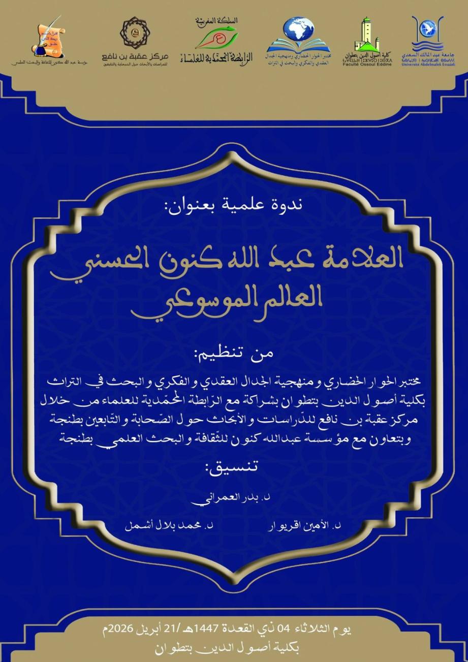 تستعد مدينة تطوان لاحتضان لقاء علمي يوم الثلاثاء 21 أبريل 2026 بكلية أصول الدين، يتمحور حول شخصية العلامة عبد الله كنون الحسني، تحت شعار يبرز مكانته كأحد أعلام المعرفة الموسوعية في المغرب.